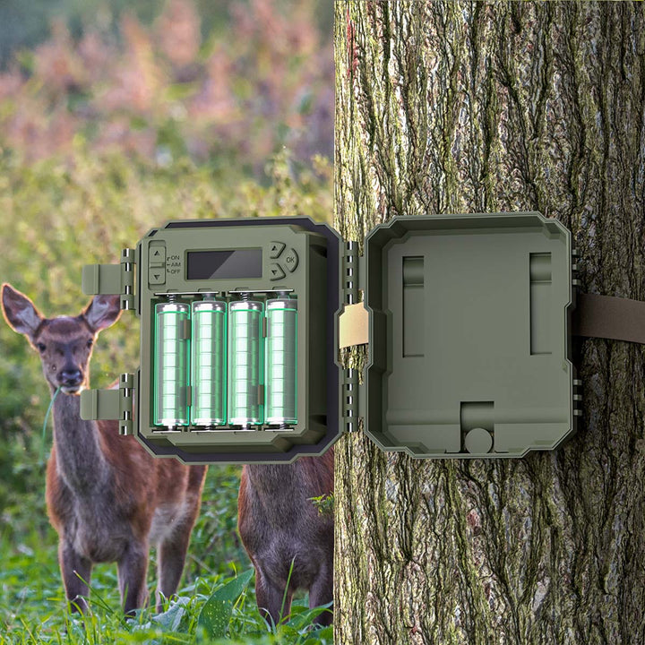 This wildlife camera only needs 4 AA batteries, which reduces the size and weight of the camera. Extremely low power consumption in standby mode allows for the camera to be put on the field longer without having to swap out batteries.
