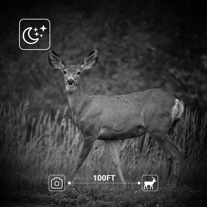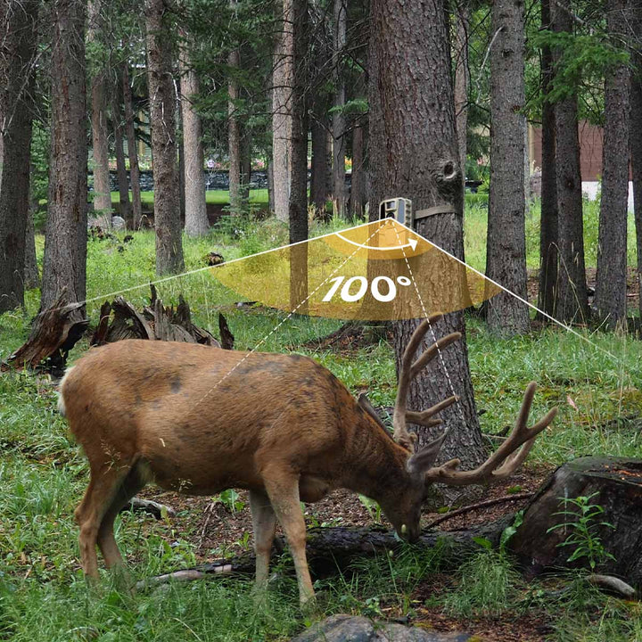 Equipped with a 100° wide-angle lens, our wildlife camera provides a broader monitoring range, reducing blind spots to comprehensively capture the surrounding environment. The camera has a 100-foot trigger distance, allowing it to monitor a larger area and capture targets at greater distances, improving monitoring efficiency.